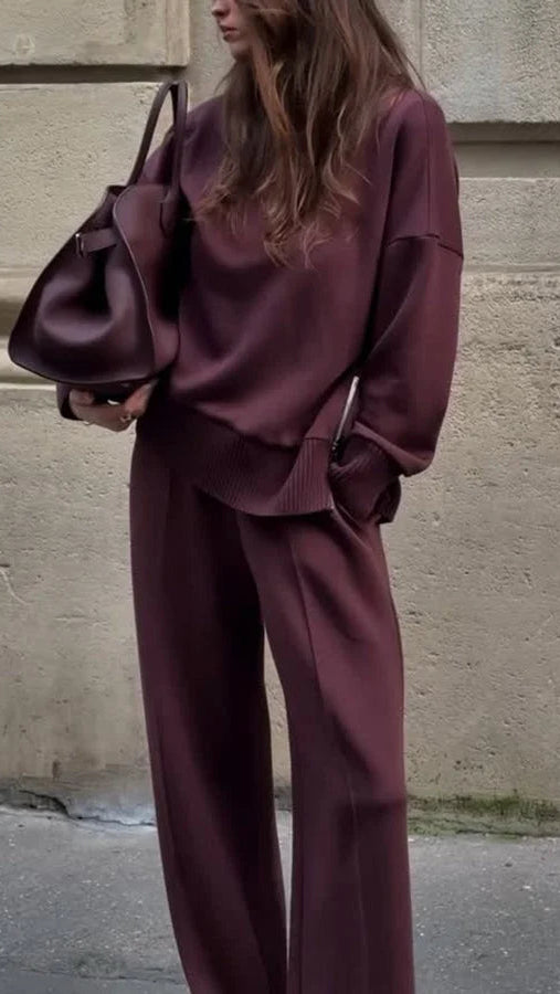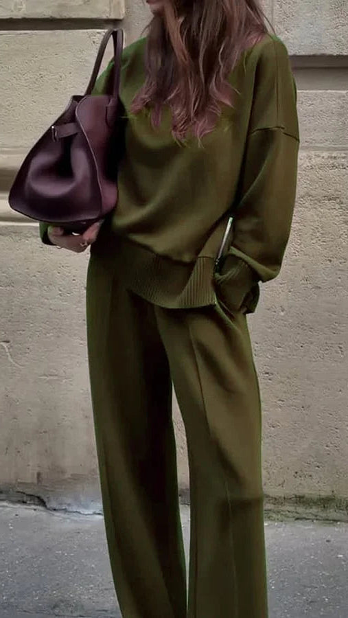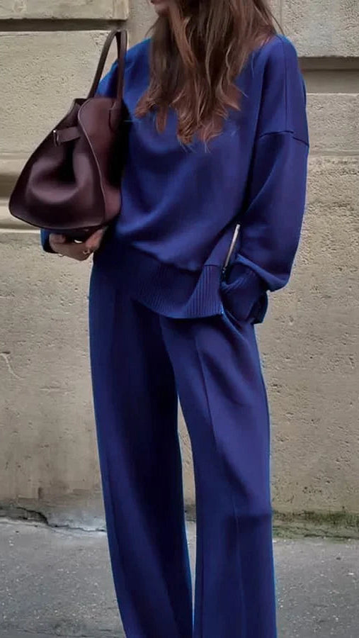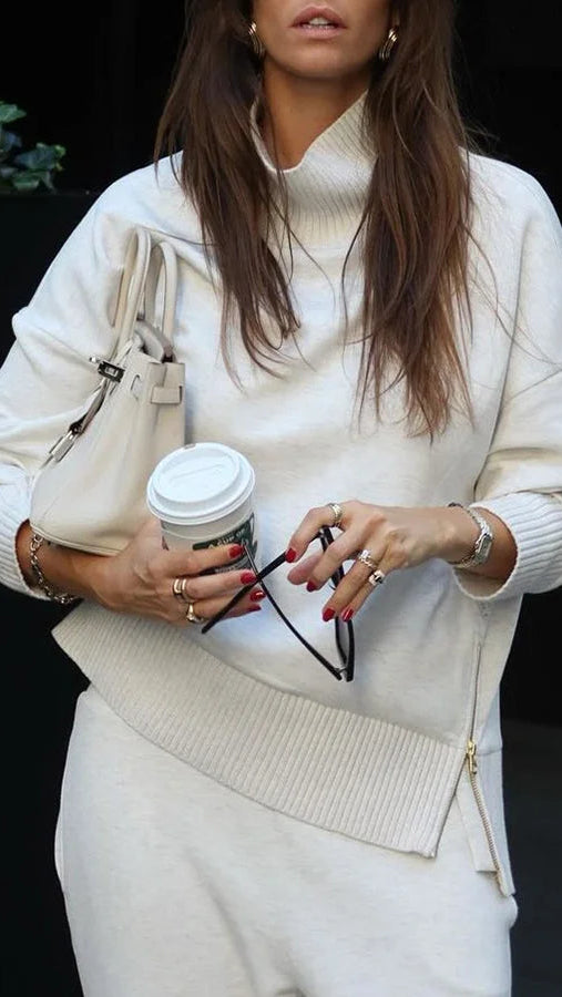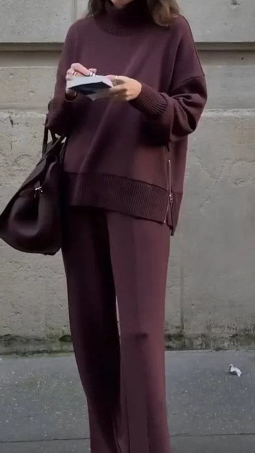 Moteriškas madingas megztas komplektas su aukštu kaklu ir plačiomis kelnėmis
