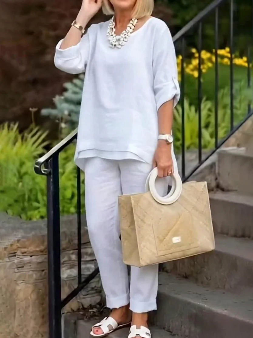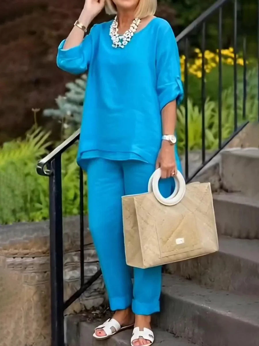 Elegantiškas, moteriškas, plačių kelnių komplektas