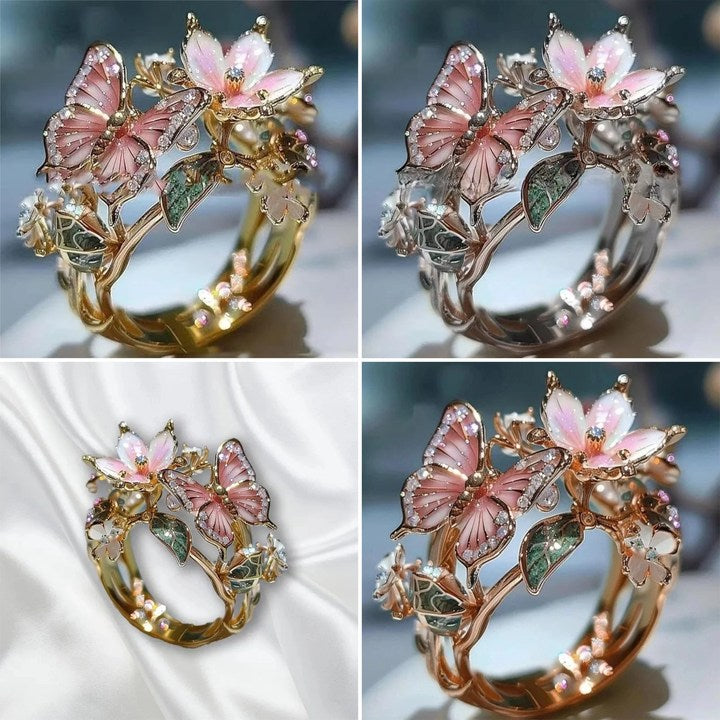 Spalvingas dekoratyvinis žiedas su drugeliu ir gėle