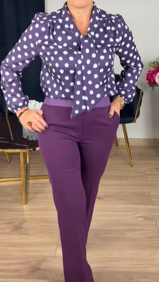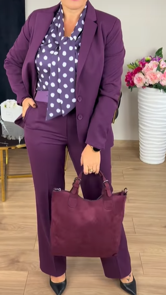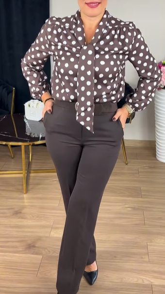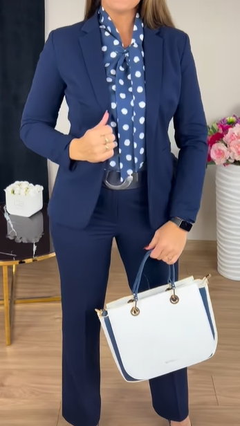 Stilingas moteriškas retro stiliaus trijų dalių kostiumas su taškeliais
